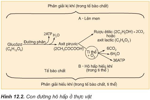 Dựa vào sơ đồ trên hình 12.2, hãy so sánh hiệu quả năng lượng của quá trình hô hấp hiếu khí và lên men.