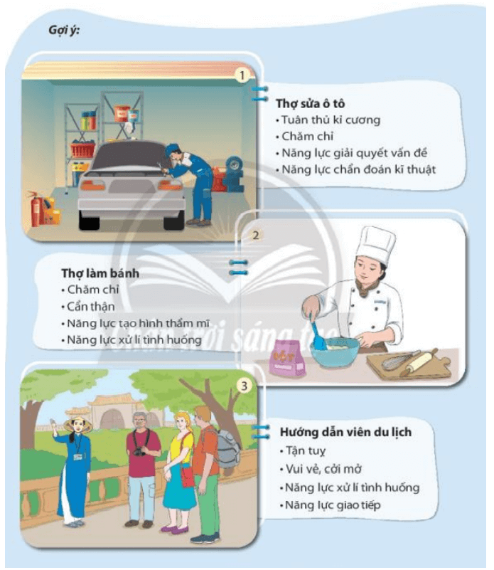 - Học sinh quan sát phẩm chất các nghề nghiệp và đưa ra nhận xét về những phẩm chất chung thường có: cẩn thận, sáng tạp, tuân thủ nội quy, tận tụy, vui vẻ và cởi mở…