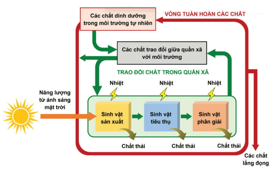 Trao đổi chất và chuyển hoá năng lượng trong hệ sinh thái được thể hiện qua vòng tuần hoàn các chất. Trong đó, vật chất và năng lượng được truyền vào cơ thể sinh vật, qua các bậc dinh dưỡng rồi từ cơ thể sinh vật truyền trở lại môi trường.