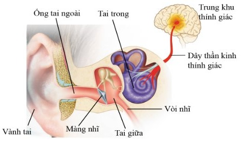 - Sóng âm phát ra từ nguồn âm thanh qua các ống tai ngoài, màng nhĩ, các xương tai giữa vào ốc tai, tác động lên tế bào thụ cảm âm thanh ở ốc tai. Xung thần kinh từ tế bào thụ cảm âm thanh theo dây thần kinh thính giác lên trung khu thính giác ở não bộ. Não bộ phân tích cho ta cảm nhận về âm thanh