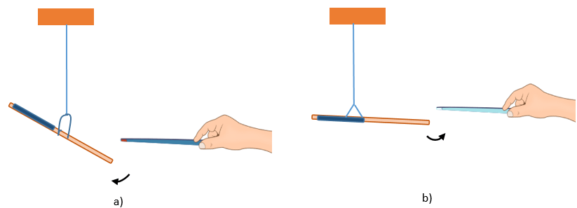 Lấy một đũa nhựa cọ vào mảnh vải len, sau đó treo lên giá thí nghiệm. Lấy chiếc đũa nhựa thứ hai cọ vào mảnh vải len rồi đưa lại gần đầu đũa nhựa kia (Hình a). Quan sát hiện tượng xảy ra.