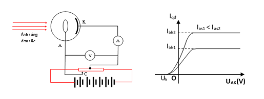 Khi rọi một chùm bức xạ điện từ thích hợp vào catot của tế bào quang điện thì trong mạch xuất hiện dòng điện, gọi là dòng quang điện, phát hiện nhờ điện kế G. Thay đổi hiệu điện thế U giữa anot và catot ta có đường đặc trưng Vôn – Ampe như trên hình vẽ.