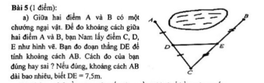 Để đo khoảng cách giữa hai điểm A và B, bạn Nam lấy điểm C, D, E (hình vẽ). Bạn đo đoạn thẳng DE để tính khoảng cách AB. Cách đo của bạn đúng hay sai? Nếu đúng, khoảng cách AB dài bao nhiêu, biết DE = 7,5m