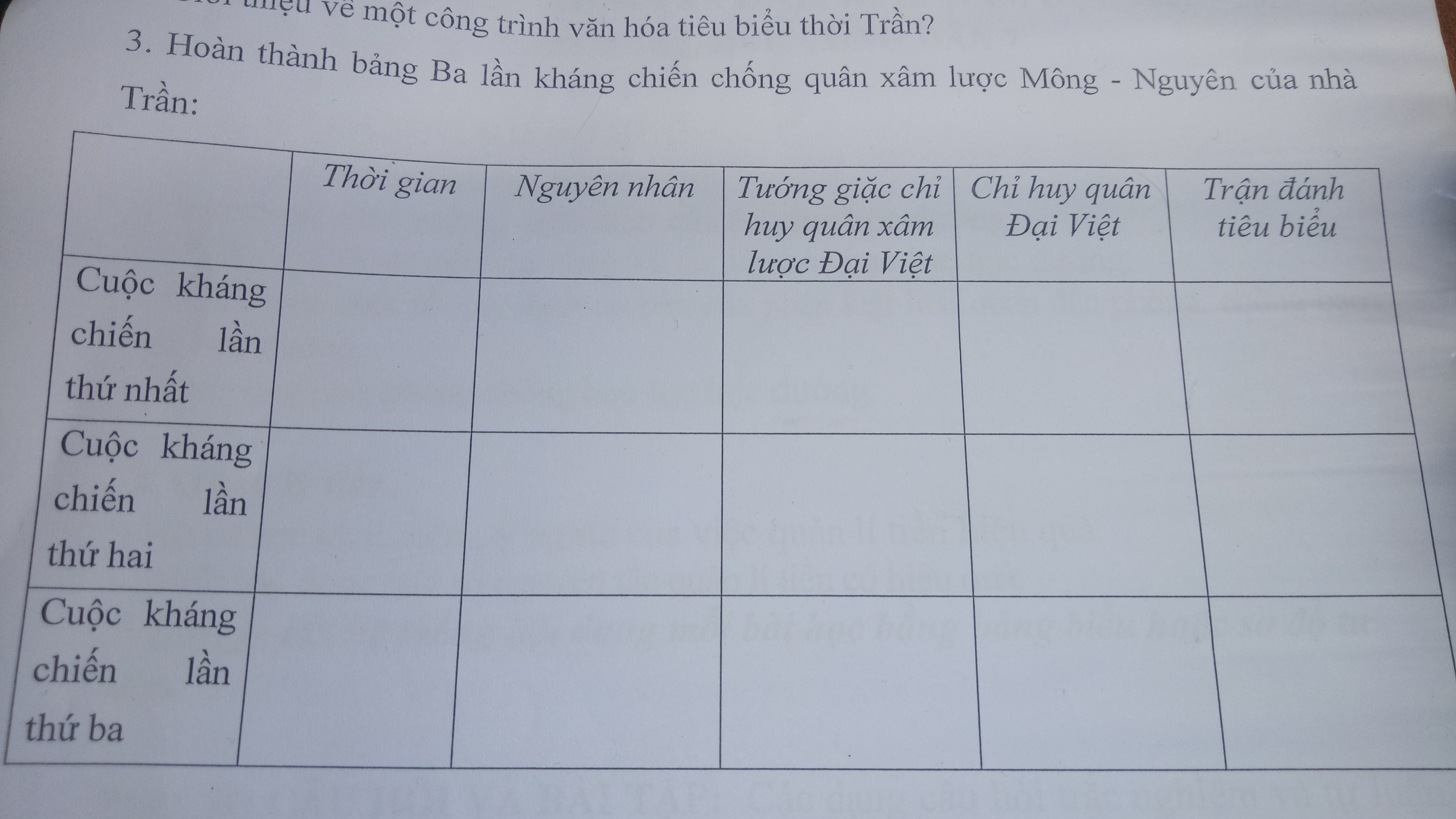 Hoàn thành bảng Ba lần kháng chiến chống quân xâm lược Mông - Nguyên của nhà Trần
