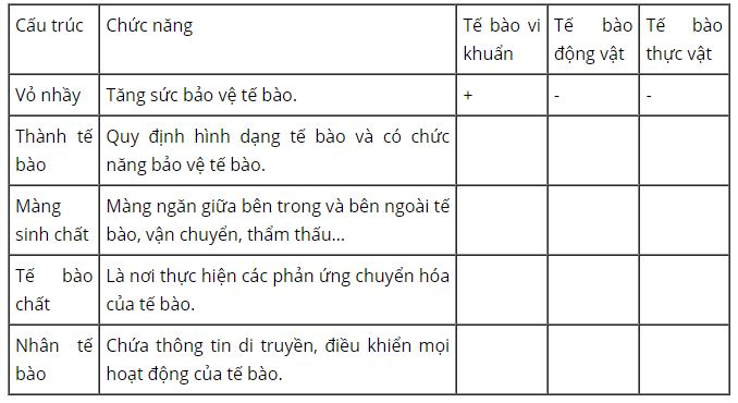 Hoàn thành bảng sau bằng cách điền dấu (+) nếu có hoặc điền dấu (-) nếu không có