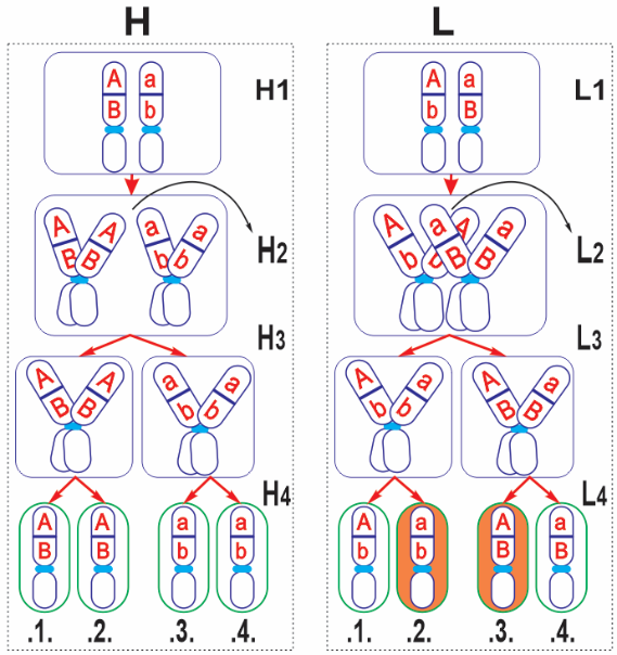 - Hai loại tế bào H và L sinh ra mấy loại giao tử? 4 loại = 2 loại liên kết và 2 loại hoán vị. - Số lượng, tỷ lệ phần trăm giao tử liên kết và hoán vị do hai loại tế bào H và L sinh ra như thế nào? + 4 loại = 2 loại liên kết và 2 loại hoán vị. + Số lượng giao tử liên kết: + Số lượng giao tử hoán vị: + Tỷ lệ giao tử liên kết: + Tỷ lệ giao tử hoán vị: |