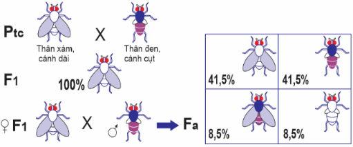 PTC : Thân xám, cánh dài ´ Thân đen, cánh cụt F1: 100 % Thân xám, cánh dài Lai phân tích cái F1: ♀ Thân xám, cánh dài ´ ♂ Thân đen, cánh cụt F2: 41.5 % Thân xám, cánh dài : 41.5 % Thân đen, cánh cụt 8.5 % Thân xám, cánh cụt : 41.5 % Thân đen, cánh dài |