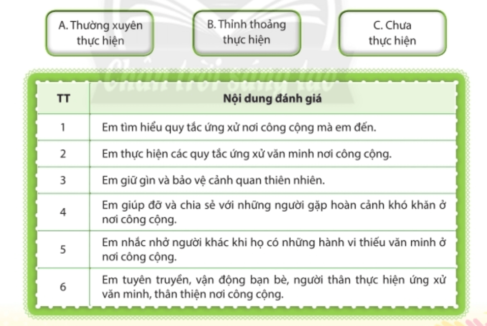 Hoạt động 2 trang 55 HĐTN lớp 6. Với nội dung đánh giá dưới đây hãy xác định một mức độ phù hợp nhất với em.