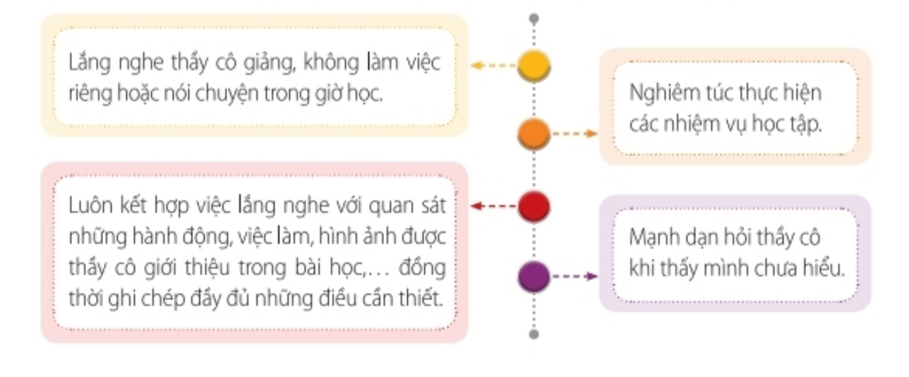 + Luôn kết hợp việc lắng nghe với quan sát những hành động, việc làm, hình ảnh được thầy cô giới thiệu trong bài học,… đồng thời ghi chép đầy đủ những điều cần thiết.