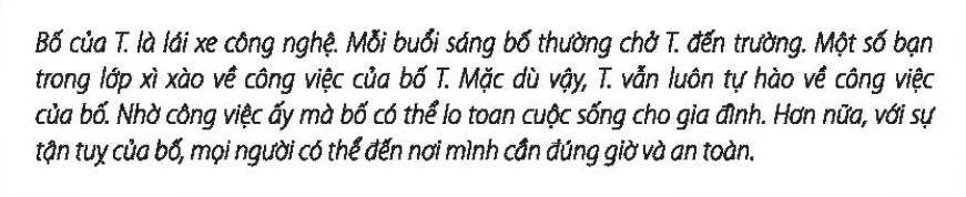 - T tự hào về công việc của bố vì: nhờ có công việc ấy bố có thể lo toan cuộc sống cho gia đình. Với sự tận tuỵ của bố mọi người có thể đến nơi cần đến và đúng giờ.
