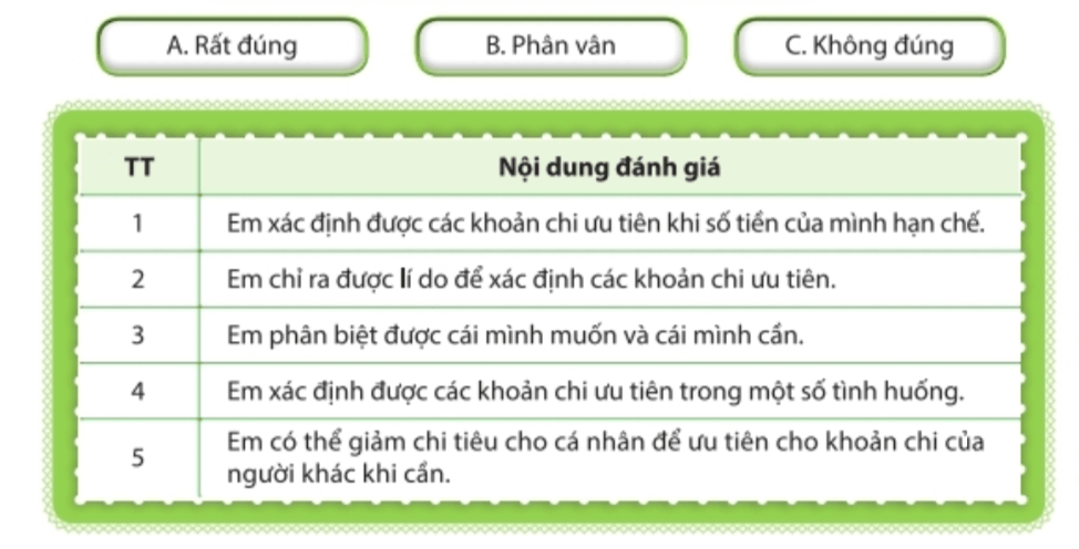 Hoạt động 2 trang 46 HĐTN lớp 6. Với mỗi nội dung đánh giá sau đây, hãy xác định một mức độ phù hợp nhất với em.
