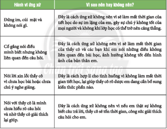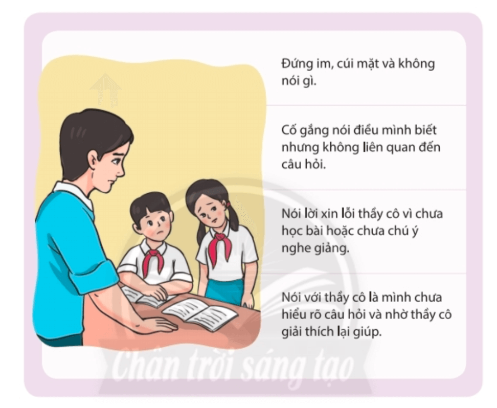 Hoạt động 1 trang 30 HĐTN lớp 6. Trong giờ học, khi thầy cô gọi em trả lời câu hỏi liên quan đến bài học mà em không biết trả lời, em lựa chọn cách ứng xử nào dưới đây? Vì sao?