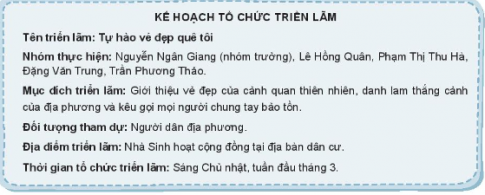 - Hoạt động 3: Xây dựng kế hoạch tổ chức sự kiện giới thiệu về vẻ đẹp cảnh quan thiên nhiên, danh lam thắng cảnh của địa phương và cách bảo tồn