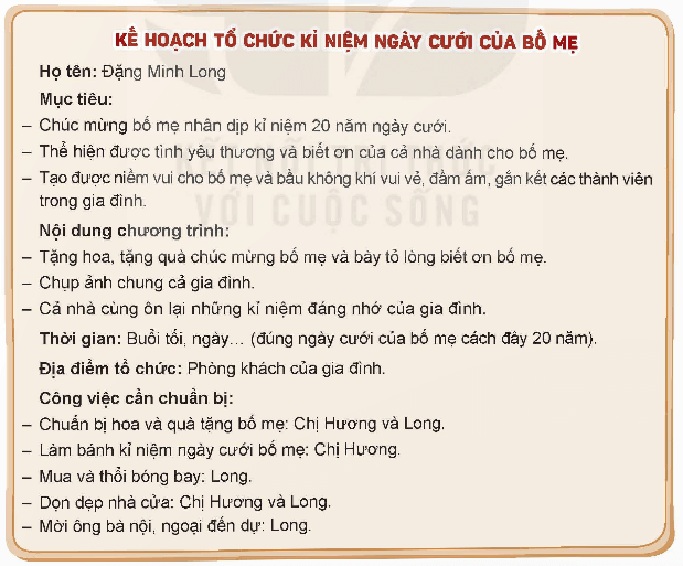 Câu 1 (trang 29 Hoạt động trải nghiệm 9): Lựa chọn một hoạt động hoặc sự kiện có ý nghĩa với gia đình em để lập kế hoạch tổ chức.