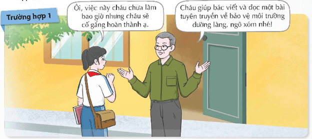 - Trường hợp 1: Dù chưa viết và đọc một bài tuyên truyền về bảo vệ môi trường đường làng, ngõ xóm bao giờ nhưng bạn nhỏ vẫn cố gắng học hỏi, tìm hiểu để hoàn thành nhiệm vụ được giao.