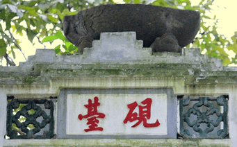 + Thân tháp có khắc ba chữ “Tả Thanh Thiên” (nghĩa là viết lên trời xanh). Đài nghiên (nghiên mực được làm bằng đá, hình nửa quả đào bổ dọc, có hình ba con ếch đội).