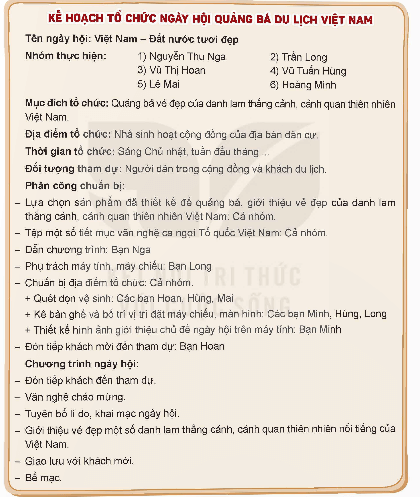 Câu 1 (trang 44 Hoạt động trải nghiệm 9): Tổ chức sự kiện quảng bá danh lam thắng cảnh, cảnh quan thiên nhiên của đất nước theo kế hoạch đã xây dựng.