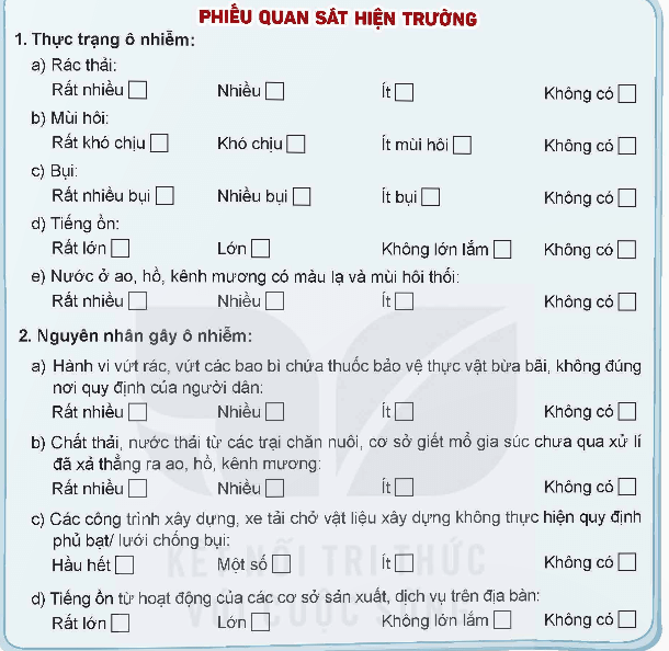 Câu 1 (trang 44 Hoạt động trải nghiệm 9): Thiết kế công cụ khảo sát về nguyên nhân gây ô nhiễm môi trường tại địa bàn sinh sống cho đề tài đã lựa chọn.