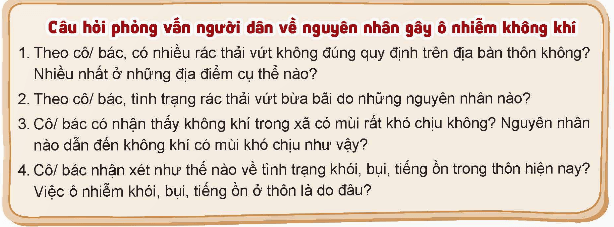 Câu hỏi (trang 44 Hoạt động trải nghiệm 9): Thảo luận cách thực hiện đề tài khảo sát về nguyên nhân gây ô nhiễm môi trường tại địa bàn sinh sống