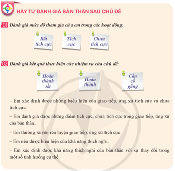 Em tự đánh giá mức độ tham gia các hoạt động và kết quả thực hiện nhiệm vụ theo các thang: rất tích cực – tích cực – chưa tích cực và hoàn thành tốt – hoàn thành – cần cố gắng.