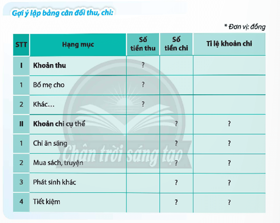 - Xây dựng ngân sách hợp lí, phù hợp với bản thân: Em muốn tiết kiệm để mua quà tặng sinh nhật cho cho mẹ vào năm sau, giá trị của món quà là 1.000.000đ. Bố mẹ thường cho em 300 000 đồng mỗi tháng để chi tiêu. Em tập kinh doanh hàng handmade và thường thu được 150 000 đồng tiền lãi mỗi tháng. Thỉnh thoảng, em cũng được người thân thưởng khi học tập tốt.