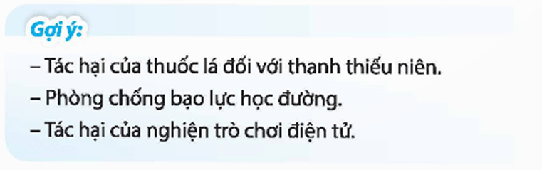 - Thực trạng nghiện mạng xã hội của học sinh hiện nay. - Những tác hại của việc nghiện mạng xã hội đối với học sinh. - Những biện pháp cộng đồng, gia đình có thể thực hiện để hỗ trợ học sinh nhận thức đúng và sử dụng mạng xã hội an toàn, lành mạnh. |