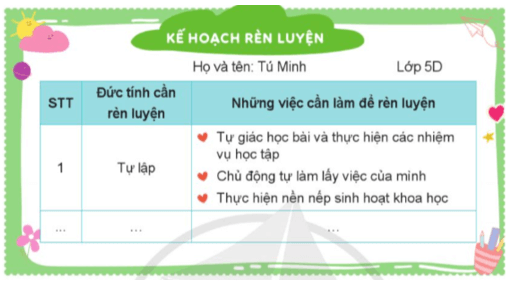 - HS lập kế hoạch rèn luyện các đức tính cần thiết để thích ứng với môi trường học tập mới theo gợi ý.