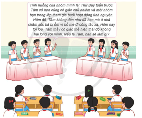 VD: Tình huống của nhóm mình là: Thứ Bảy tuần trước, Tâm có hẹn cùng cô giáo chủ nhiệm và một nhóm bạn trong lớp tham gia buổi hoạt động tình nguyên. Hôm đó, Tâm không đến như đã hẹn mà ở nhà chăm sóc bà bị ốm vì bố mẹ đi công tác xa. Hôm nay tới lớp. Tâm thấy cô giáo thể hiện thái độ không hài lòng với mình. Nếu là Tâm, bạn sẽ làm gì?