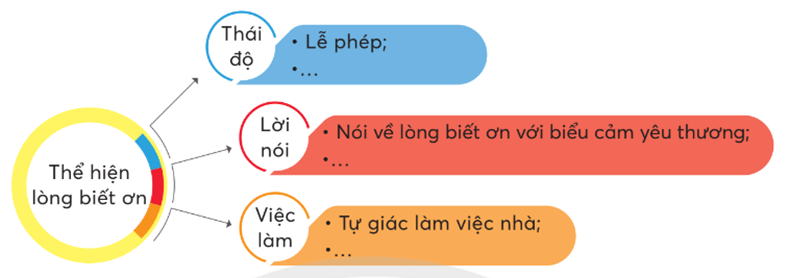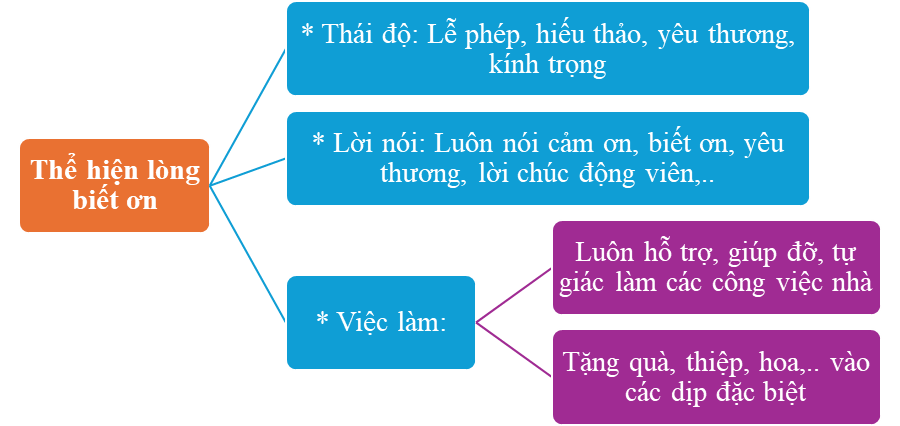 2. Lập sơ đồ tư duy về thái độ, lời nói, việc làm để thể hiện lòng biết ơn đối với các thành viên trong gia đình.