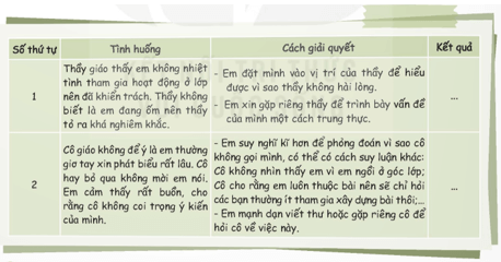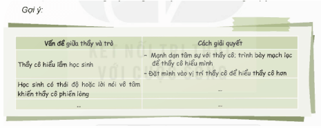 - Lập bảng ghi lại các vấn đề thường gặp và cách giải quyết. Gợi ý: Khi thầy cô hiểu lầm học sinh thì học sinh cần phải mạnh dạn tâm sự với thầy cô và đặt mình vào vị trí của thầy cô để hiểu thầy cô hơn.