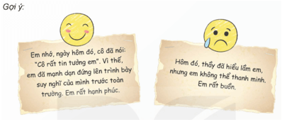 - HS lắng nghe các phản hồi của thầy cô giáo về những kỉ niệm vui, buồn, những băn khoăn của em và nói ra tâm sự của mình để mọi người hiểu mình hơn.