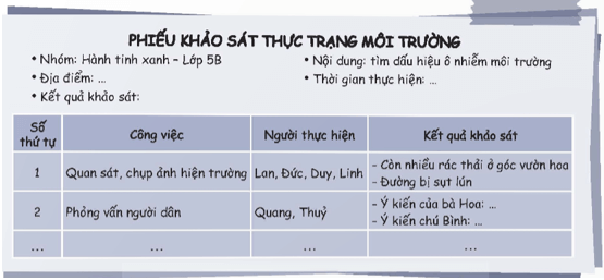 - Lập phiếu khảo sát và thực hiện cá nhân để tìm hiểu nguyên nhân gây ô nhiễm môi trường gần nơi em ở.