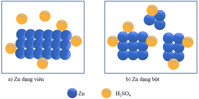 Giải thích: Để phản ứng xảy ra, cần phải có sự va chạm giữa H2SO4 và Zn. Nồng độ của H2SO4 ở ống nghiệm (b) lớn gấp đôi nồng độ H2SO4 ở ống nghiệm (a), do vậy số va chạm của H2SO4 với Zn trong ống nghiệm (b) sẽ nhiều hơn, dẫn đến tốc độ phản ứng ở ống nghiệm (b) là lớn hơn.