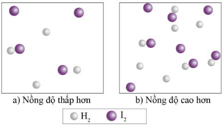 Khi nồng độ của H2 và I2 tăng lên trong một đơn vị thể tích, các phân tử này cũng sẽ nhiều hơn, dẫn đến số lượng va chạm giữa chúng (trong cùng một đơn vị thời gian) tăng lên. Vì vậy tốc độ phản ứng tăng lên khi nồng độ các chất tăng.