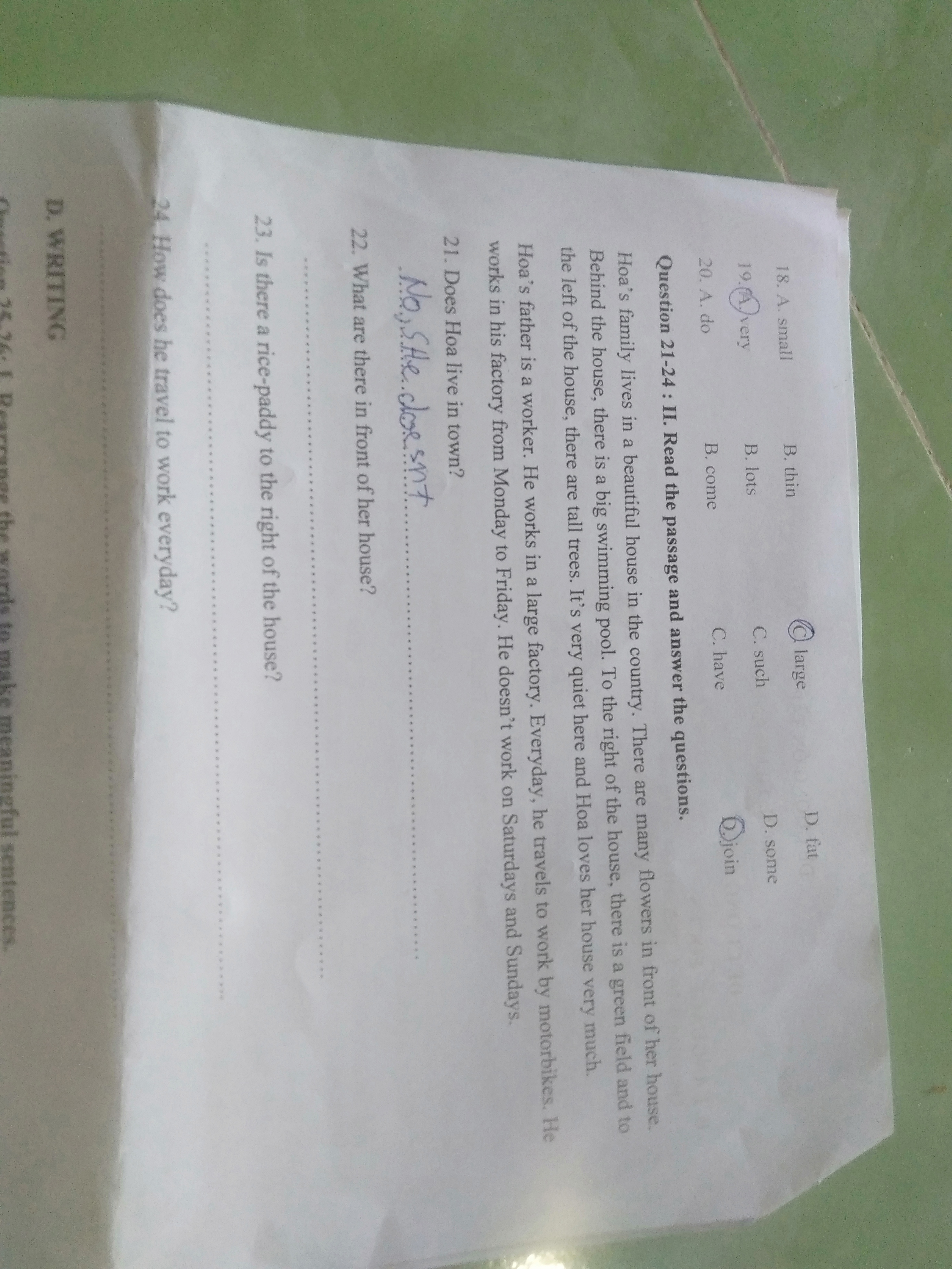 23 - No, there isn't. (green field - cánh đồng xanh khác với rice -paddy: cánh đồng lúa)