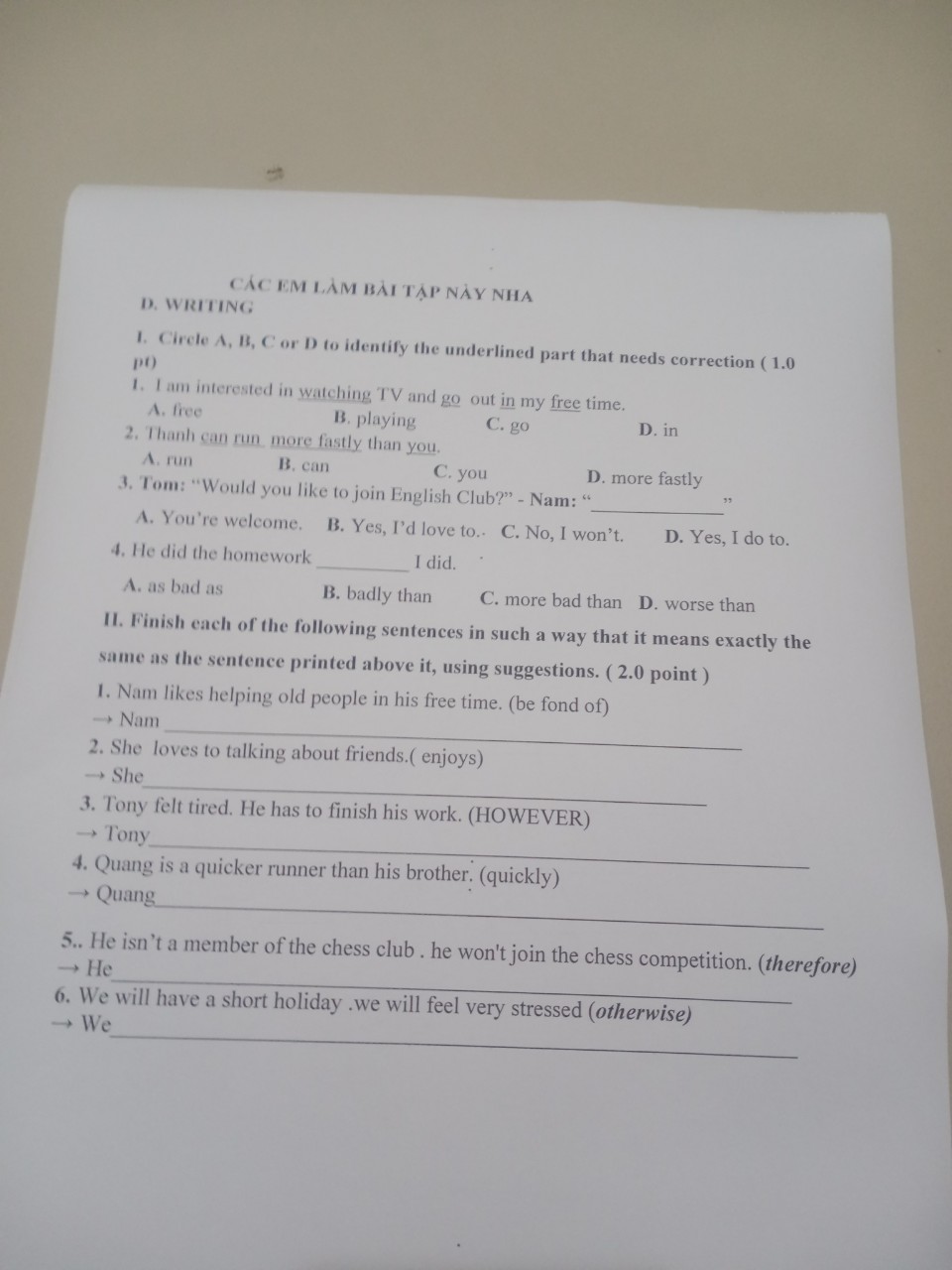 1. Circle A, B, C or D to identify the underlined part that needs correction (1.0 pt)