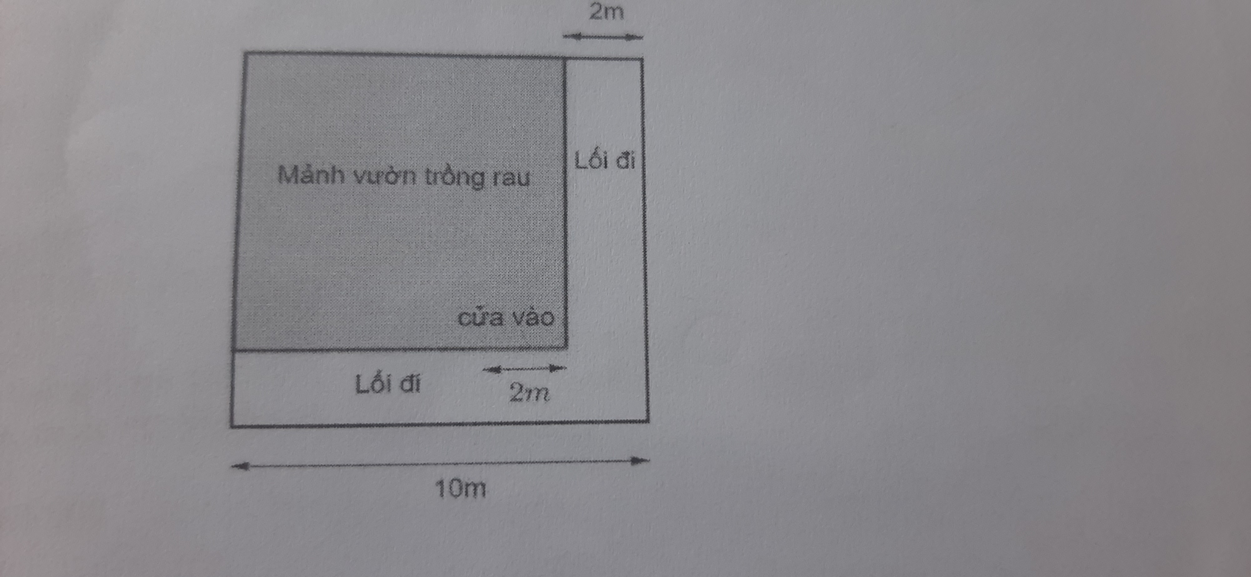 Độ dài cạnh mảnh vườn trồng rau hình vuông là: 10 – 2 = 8m