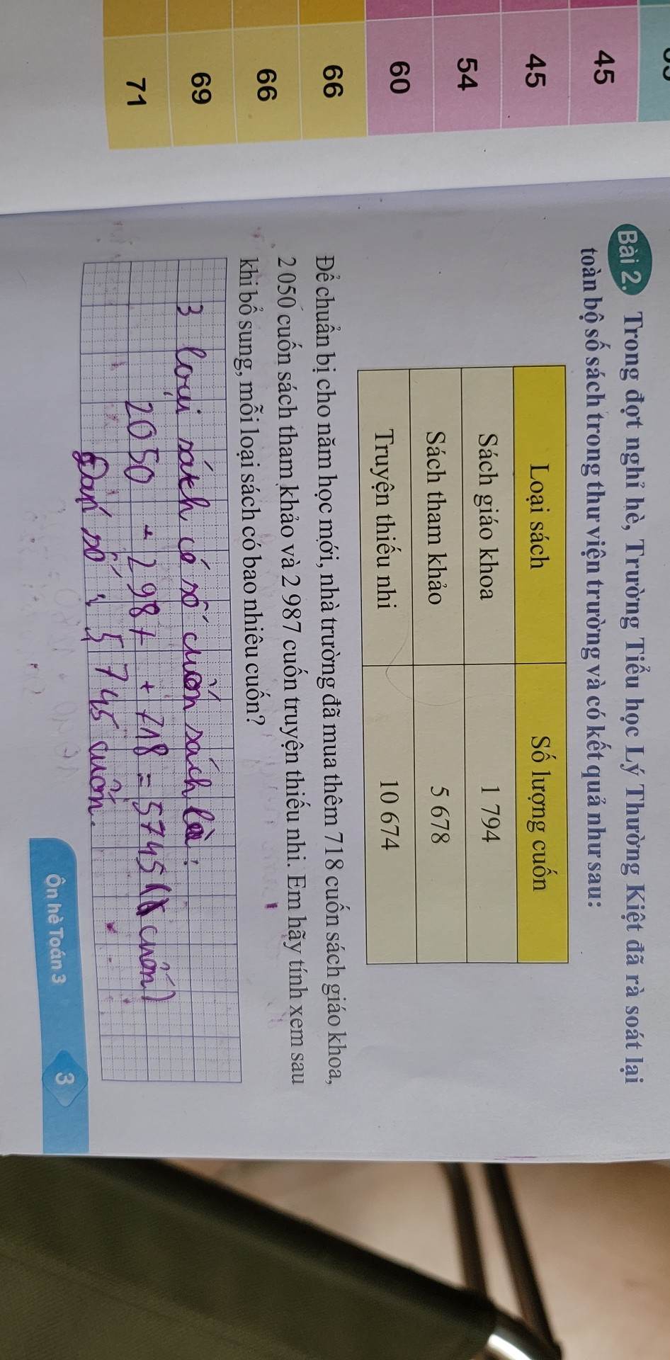 Lấy số sách mỗi loại thư viện thống kê được ban đầu, cộng với số sách mỗi loại sau khi bổ sung thêm là ra nha