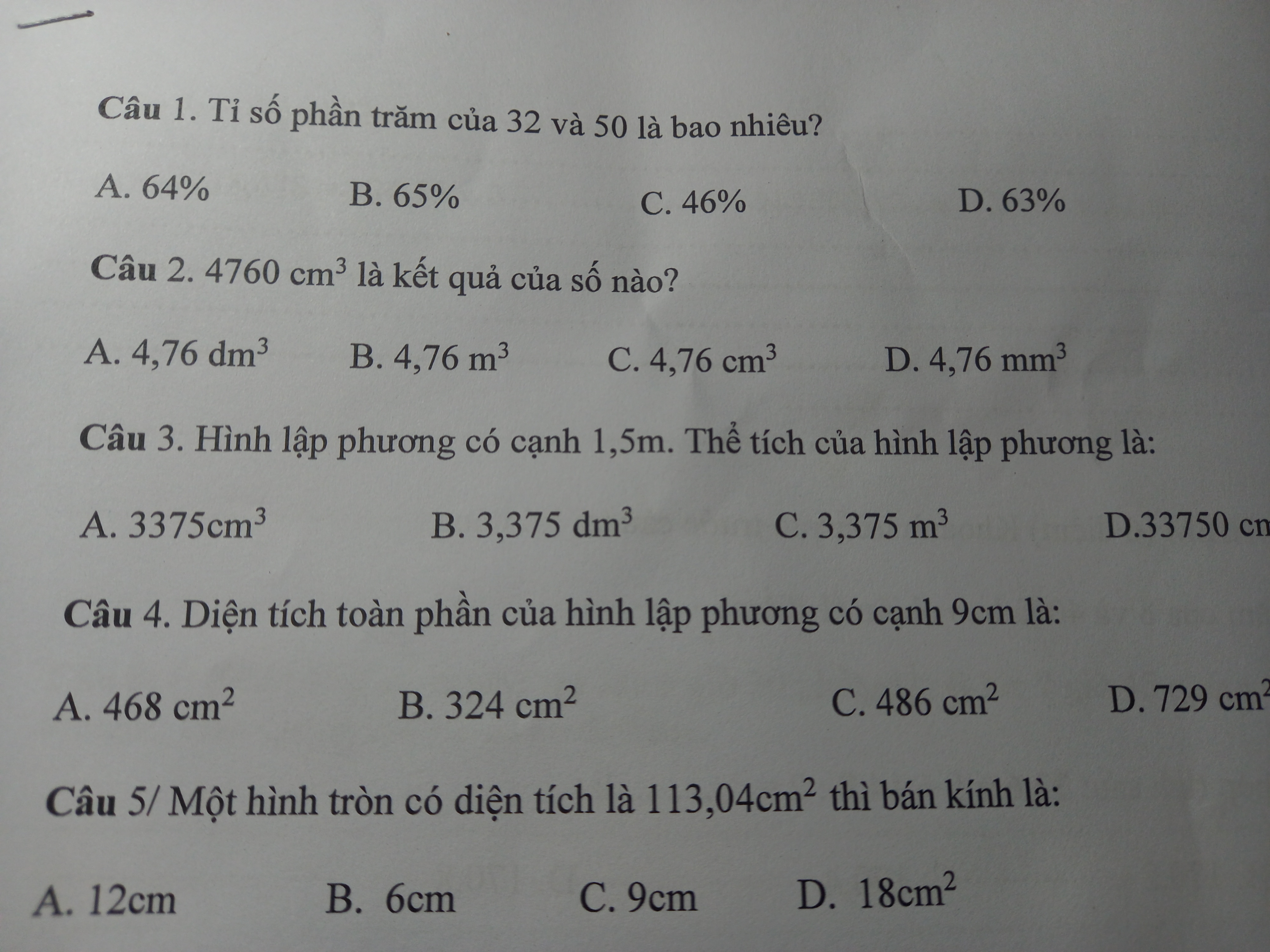 Câu 4: Diện tích toàn phần của hình lập phương là: 9 x 9 x 6 = 486 cm2