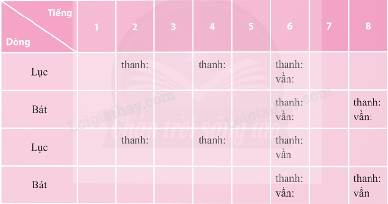 - Lần lượt điền các tiếng của từng dòng thơ vào các ô theo bảng dưới đây (làm vào vở) để kiểm tra thanh điệu và cách hiệp vần.