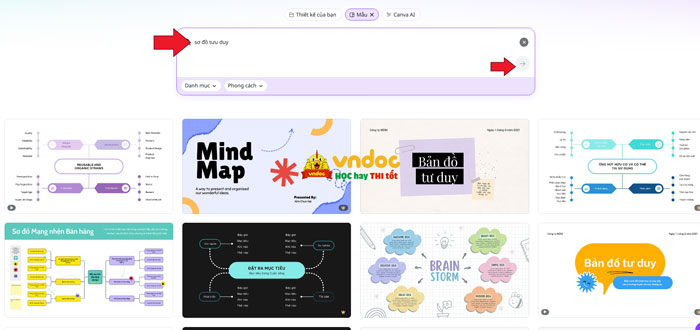 Trước hết bạn đăng nhập vào tài khoản Canva. Trong giao diện chính bạn nhấn vào Tạo thiết kế, rồi nhập từ khóa Bản đồ tư duy để làm sơ đồ tư duy trên Canva.