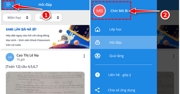 Để cập nhật thêm thông tin, bảo mật cho tài khoản hoặc đổi mật khẩu trên SHub Classroom, các bạn lựa chọn vào biểu tượng 3 dấu gạch ngang -> Chọn vào tên người dùng.