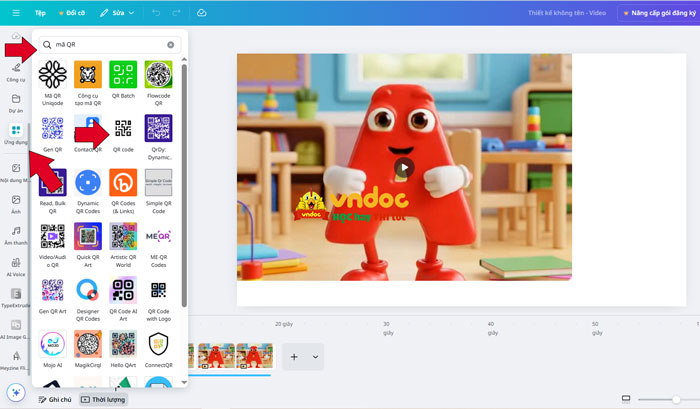 Bước 3: Trên thanh công cụ phía bên trái giao diện chính, nhấn vào tab Ứng dụng -> tại ô tìm kiếm gõ từ khóa “mã QR code” -> chọn Mã QR code.