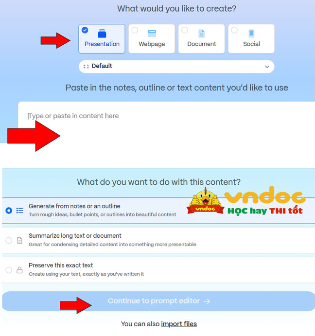 Bước 6: Chọn “Thuyết trình”, “Truyền thống” và dán kết quả ChatGPT đưa ra vào cùng Prompt bên dưới. Bấm “Tạo từ ghi chú hoặc phác thảo” và nhấn “Tiếp tục nhắc nhở biên tập viên” Thay đổi nội dung nếu cần thiết và bấm “Tiếp tục” Chọn chủ đề.