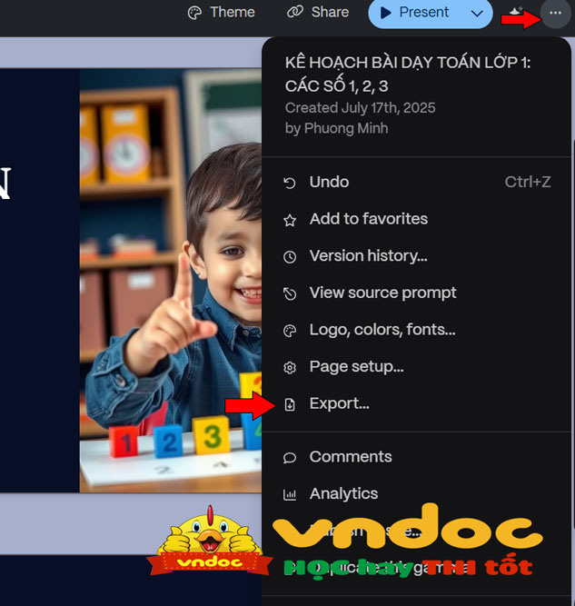 Bước 7: Chờ vài phút để gamma tạo Sildes. Sau khi hoàn thành, kích vào dấu 3 chấm ở góc phải màn hình -> chọn Export để tải về.