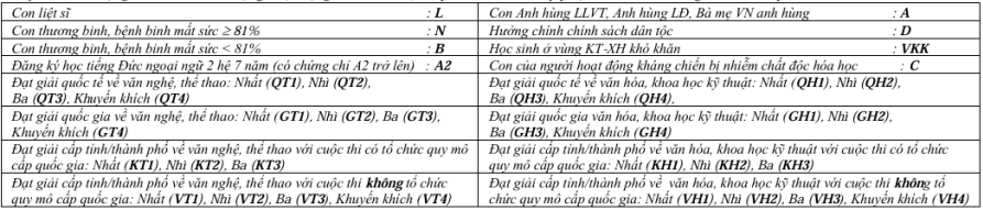 Chú ý: Nếu TS có nhiều diện được quy định ghi tắt ở trên thì giữa mỗi loại cách nhau bởi dấu ",". Ví dụ: VH2, D, VKK, A2 (HS có giải Nhì Thành phố môn văn hóa, được hưởng chính sách dân tộc, học sinh ở vùng KT-XH khó khăn, đăng ký học tiếng Đức ngoại ngữ 2 hệ 7 năm và có chứng chỉ tiếng Đức A2 trở lên).