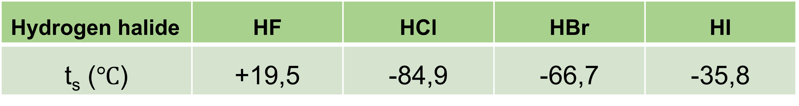 Bảng 2: Nhiệt độ sôi (ts) của các hydrogen halide