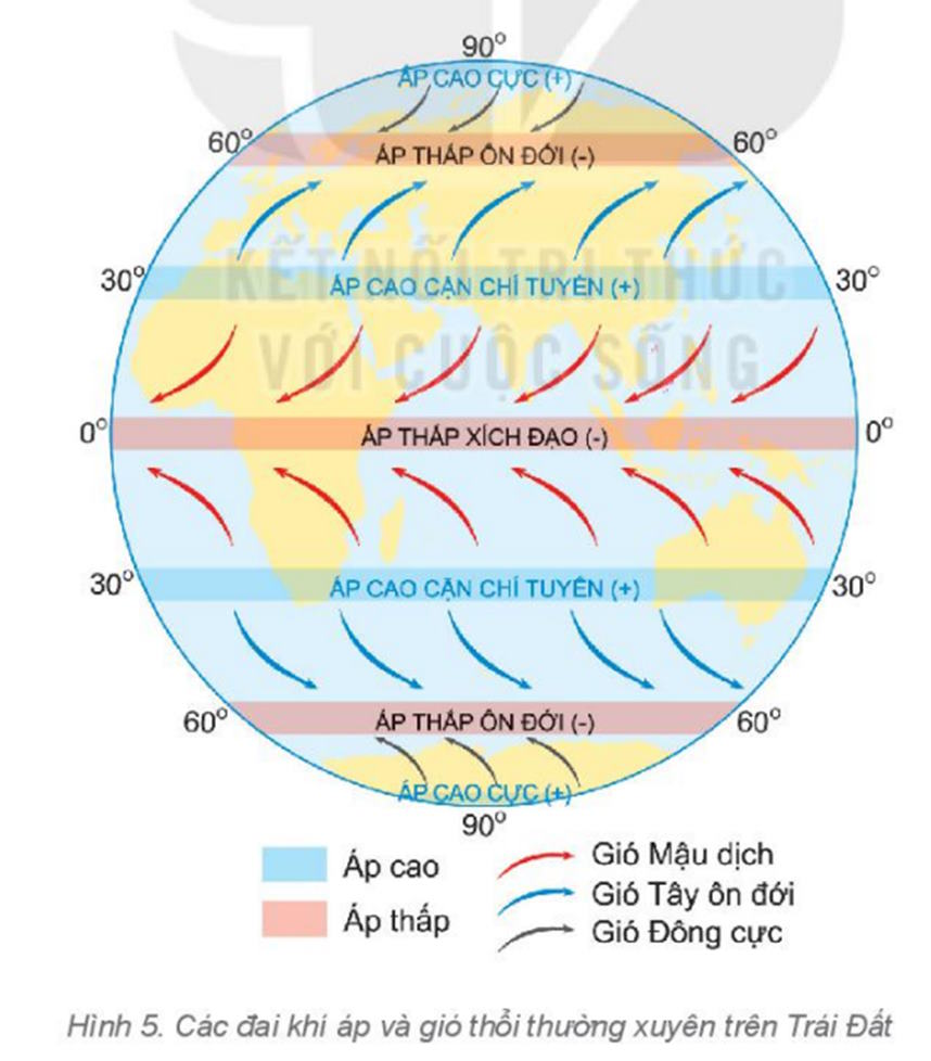 - Trên bề mặt Trái Đất, luôn tồn tại các đai áp cao và áp thấp phân bố xen kẽ, đối xứng với nhau qua áp thấp xích đạo, tạo thành các khu vực riêng biệt từ xích đạo về hai cực.