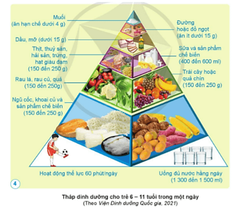 Câu hỏi quan sát trang 78 SGK Khoa học lớp 4: Dựa vào hình 4, nêu tên các nhóm thực phẩm cần thiết cho trẻ từ 6-11 tuổi trong mỗi ngày. Trong đó, thực phẩm nào nên ăn hạn chế, thực phẩm nào nên ăn ít?
