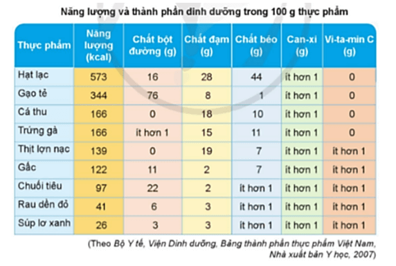 Câu hỏi quan sát trang 75 SGK Khoa học lớp 4: Dựa vào thông tin trong bảng dưới đây, nêu ví dụ về các thức ăn khác nhau thì cung cấp cho cơ thể năng lượng và các chất dinh dưỡng khác nhau.